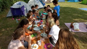 Dort angekommen bauten wir zuerst alle einmal unsere Zelte auf. Gegenseitig halfen wir uns und so waren die Zelte recht schnell aufgestellt. Danach hüpften wir zur Abkühlung in den See. Zum gemeinsamen Abendessen hatten wir von der Bäckerei Nußbaumer als Spende sehr leckere Brötchen bekommen. Den weiteren Abend verbrachten wir gemeinsam draußen mit Spielen und Gesprächen. Recht spät schliefen dann alle in ihren Zelten ein.