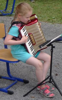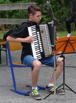 Das schöne Wetter – Petrus hatte rechtzeitig ein Einsehen und vertrieb am frühen Morgen die Regenwolken – bot die perfekte Voraussetzung, um gemeinsam den vielfältigen musikalischen Beiträgen auf dem Akkordeon zu lauschen. Nach der Begrüßung durch Vorstand Thomas Lehmann spielte das Jugendorchester unter der Leitung von Uwe Müller zur Eröffnung drei Sätze „Ragtime“, „Song“ und „Fiesta“ aus der Suite „Open Air“(!) von Hans-Günther Kölz. Anschließend folgten zahl- und abwechslungsreiche Solo- und Duoauftritte. Den jungen Künstlern gelang es durchweg, ihr Musikstück souverän vorzutragen, wofür sie vom Publikum mit reichlich Applaus belohnt wurden.