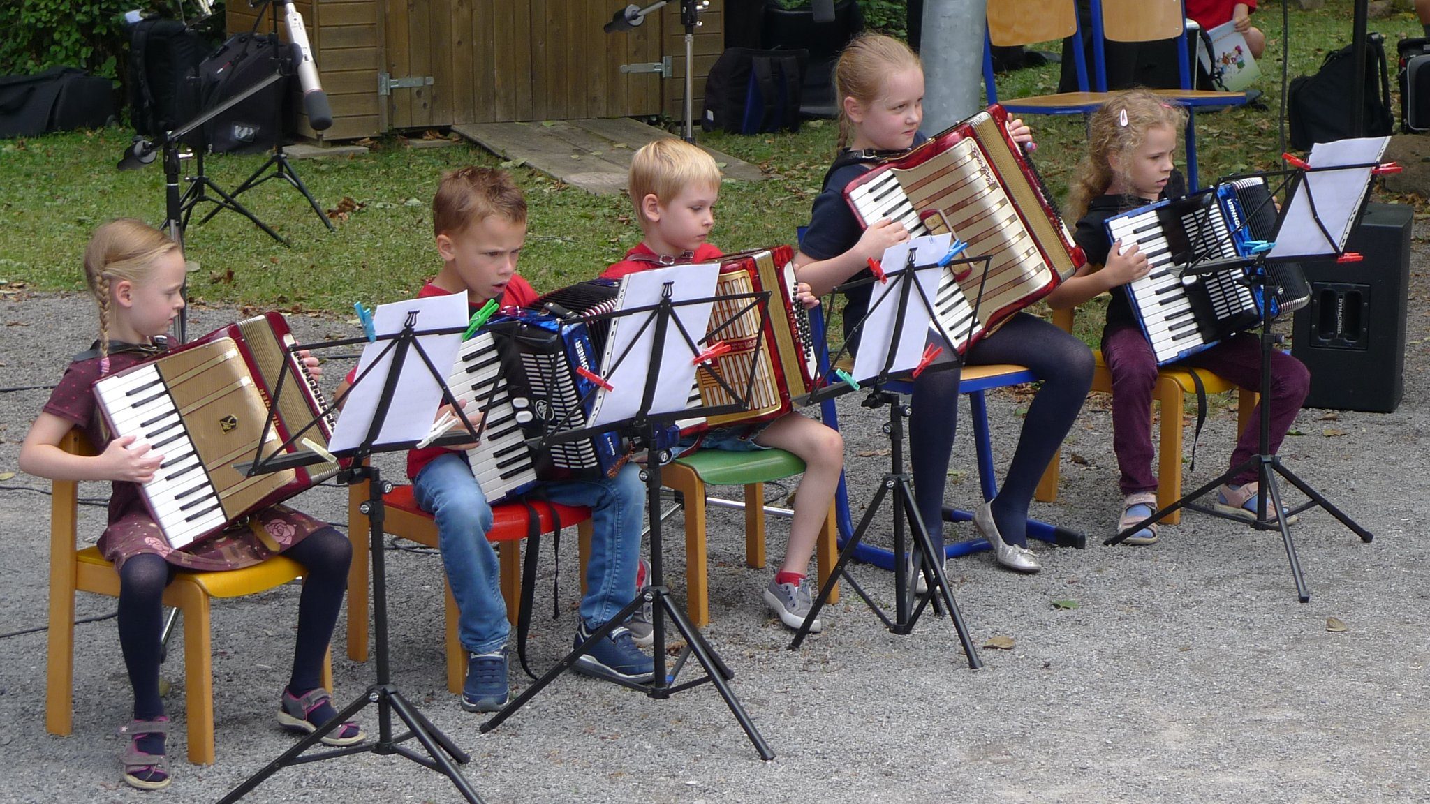 Das schöne Wetter – Petrus hatte rechtzeitig ein Einsehen und vertrieb am frühen Morgen die Regenwolken – bot die perfekte Voraussetzung, um gemeinsam den vielfältigen musikalischen Beiträgen auf dem Akkordeon zu lauschen. Nach der Begrüßung durch Vorstand Thomas Lehmann spielte das Jugendorchester unter der Leitung von Uwe Müller zur Eröffnung zwei Sätze „Song“ und „Fiesta“ aus der Suite „Open Air“(!) von Hans-Günther Kölz. Anschließend folgten zahl- und abwechslungsreiche Solo- und Duoauftritte. Den jungen Künstlern gelang es durchweg, ihr Musikstück souverän vorzutragen, wofür sie vom Publikum mit reichlich Applaus belohnt wurden. Auch die MelodicaKids, die erst seit ein paar Wochen das Akkordeon ausprobieren begeisterten mit „Blue Tulip“.