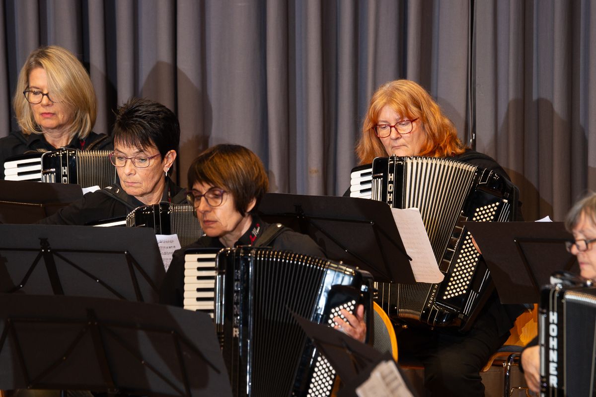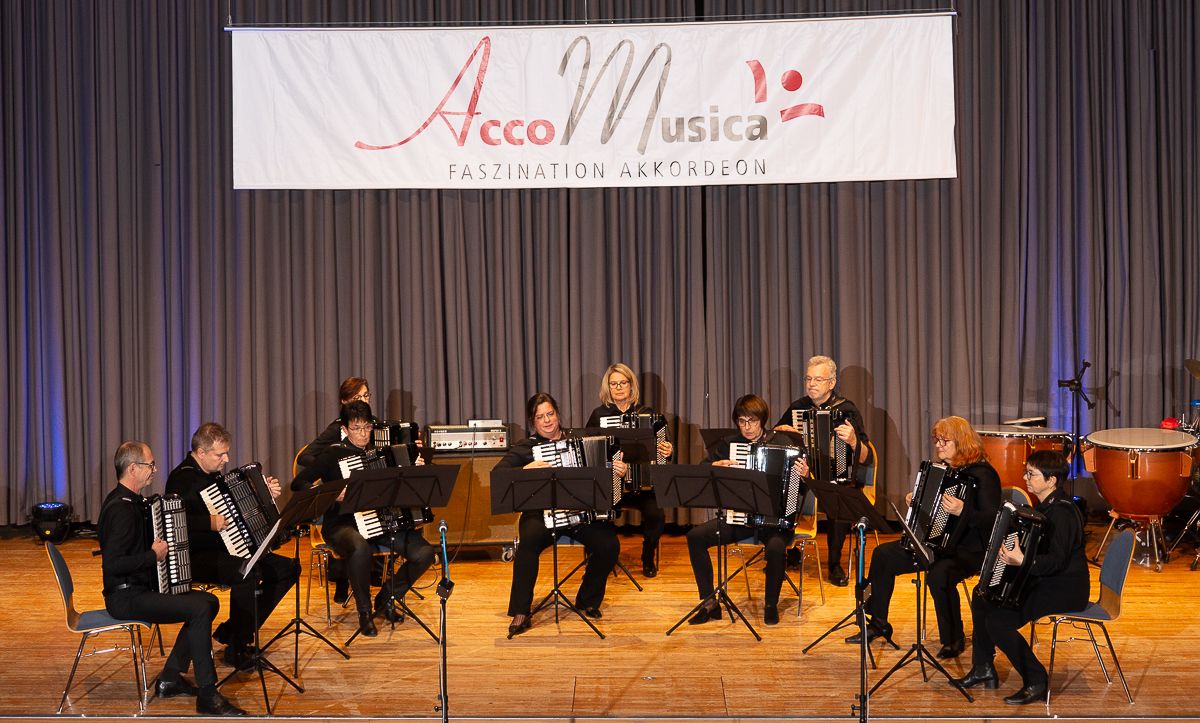 Die Eröffnung oblag dem Ersten Orchester, das aufgrund verringerter Besetzung als nicht minder hörenswertes zehnköpfiges Ensemble auftrat und vom langjährigen Dirigenten Uwe Müller vom Akkordeon aus geleitet wurde. Zu Gehör kamen drei ganz unterschiedliche Tangostücke im Stile des Tango-Altmeisters Astor Piazzolla, wobei von diesem selbst auch ein Titel erklang. Präzises Spiel, saubere Einstudierung und konzentrierter Vortrag, ein Markenzeichen von AccoMusica, überzeugten das Publikum.