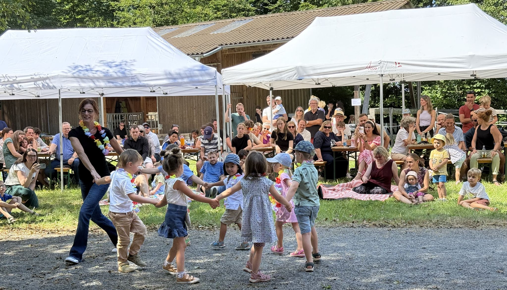 Über 60 Kinder, Jugendliche und Erwachsene tanzten, sangen, musizierten auf der Melodica und dem Akkordeon; solistisch, im Duett und im Ensemble. Die Wiese des Reitplatzes der Ludwig-Guttmann-Schule bot den weit über 100 Besuchern wieder einen schönen Rahmen für den gelungenen Schuljahresabschluss von AccoMusica.