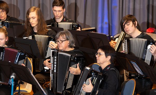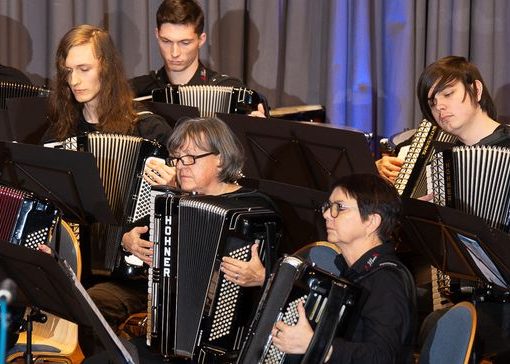 So rundeten gemeinsam aufgeführte Stücke die Einzelbeiträge ab. Ein ganz besonderes Highlight war das Stück „Psalm 47“ von Willi Vogl, eine rhythmische Komposition mit Chorgesängen und Akkordeonpassagen im Wechsel, die für die Musiker und Sänger eine große Herausforderung darstellte – im Konzert aber ein voller Erfolg war.